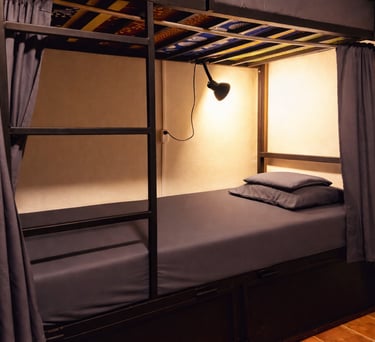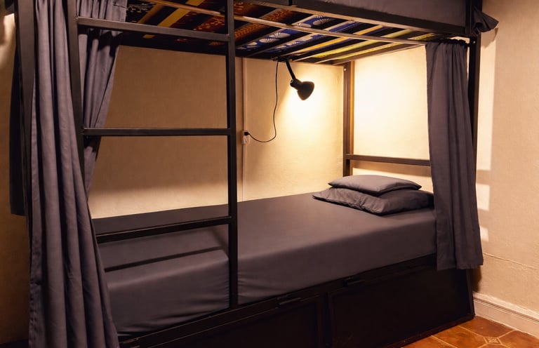 Our shared dormitory is ideal for budget travelers and backpackers looking to connect with other guests. The dorm features bunk beds with comfortable mattresses, individual reading lights, and power outlets at each bunk. Privacy curtains are available for each bed.